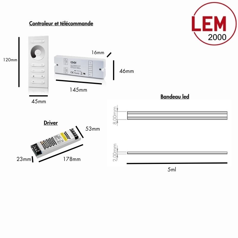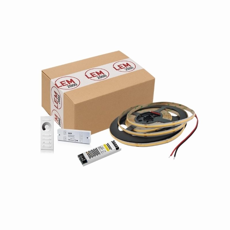 Kit bandeau LED 5m avec télécommande radio pour ajuster l'intensité lumineuse. Blanc chaud 3000K ou 4000k dimmable. Idéal salon, chambre, ambiance modulable.