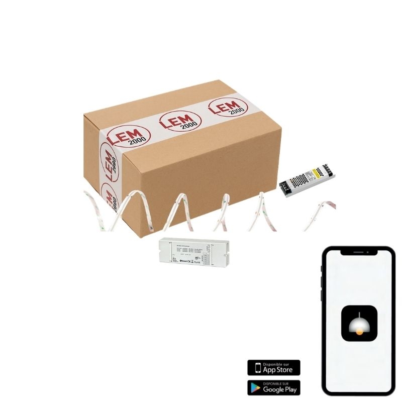 Kit bandeau LED RGB + CCT 5m avec contrôle smartphone Bluetooth. 16 millions de couleurs, température variable 2700K-6500K. Application iOS/Android incluse.