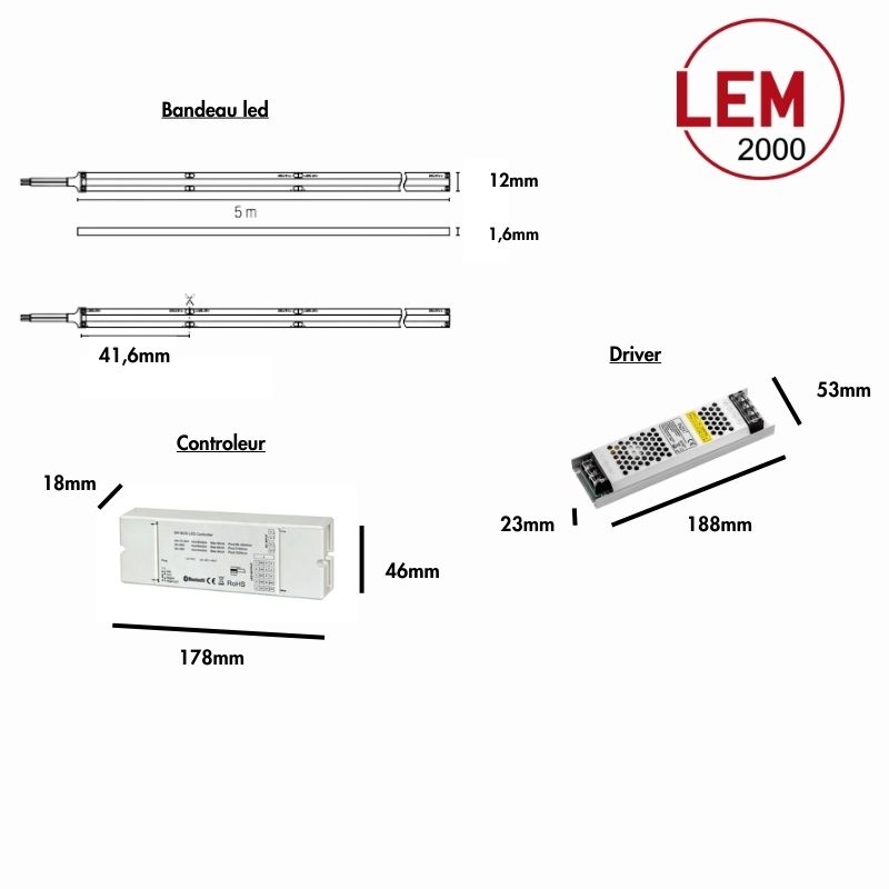 Bandeau Led RGB + CCT : longueur 5ml, largeur 12mm, hauteur 1,6mm
