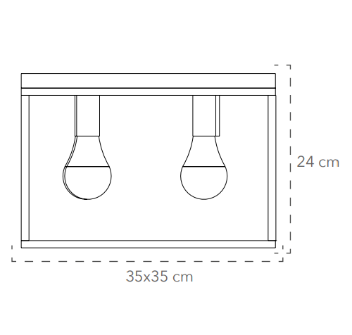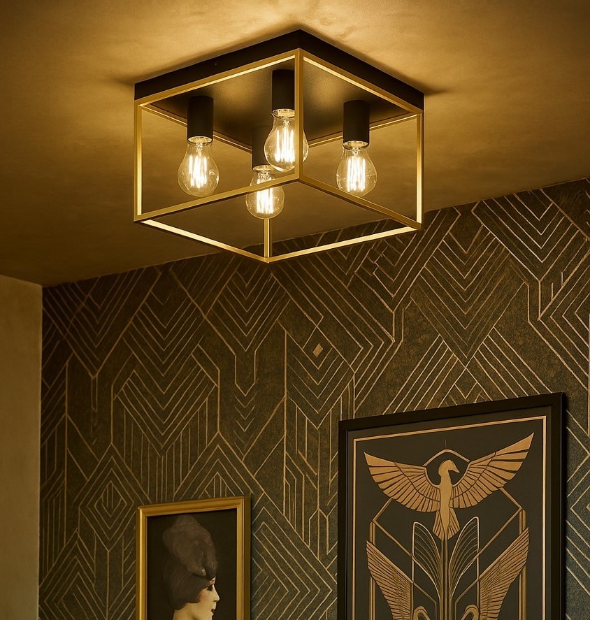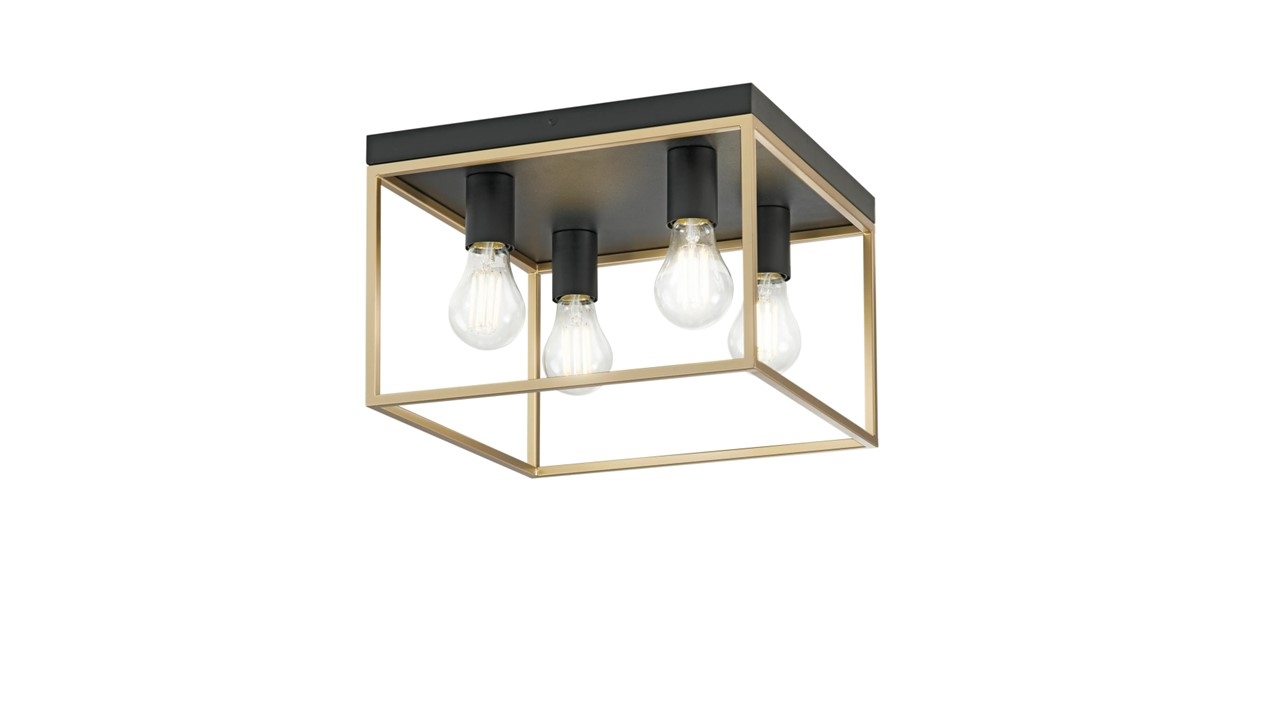 Plafonnier KIMERA de forme carrée, entièrement réalisé en métal noir et or satiné avec 4 douilles apparentes avec douille E27exclue.