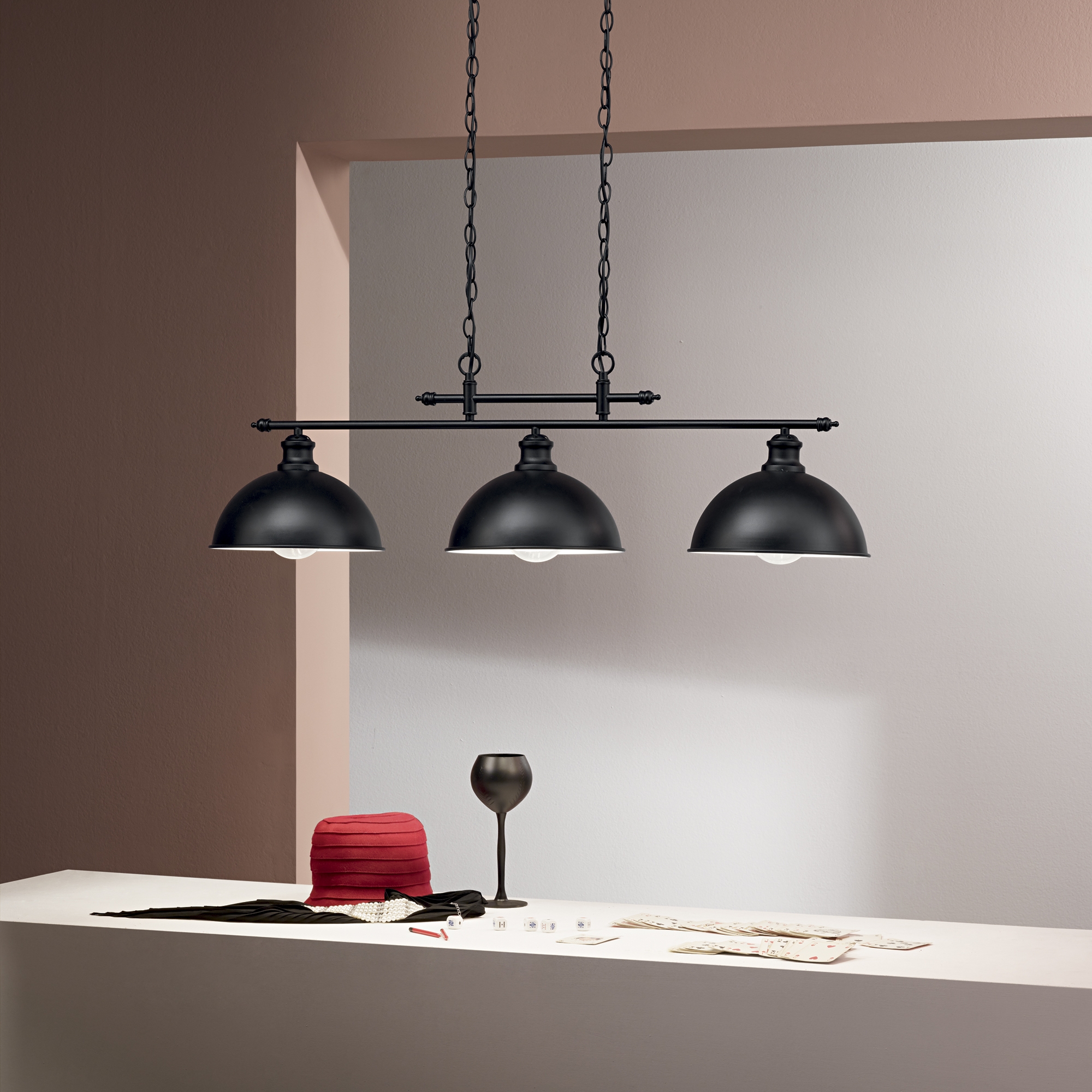 Adoptez une ambiance loft et atelier avec cette suspension industrielle à trois abat-jour en métal noir. Pensée pour illuminer un îlot de cuisine, un bar, une salle à manger ou un comptoir, elle combine design authentique et simplicité élégante.