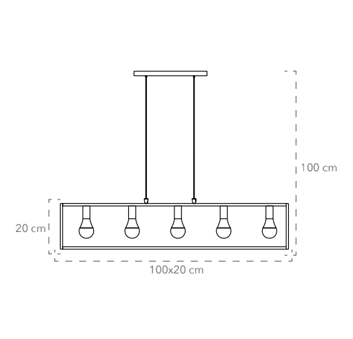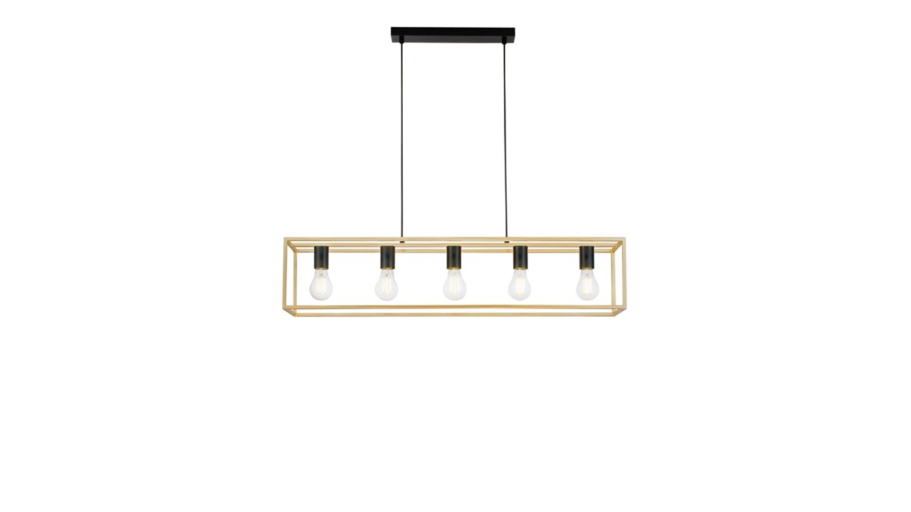 Suspension rectangulaire en métal noir et laiton avec 5 douilles E27. Hauteur réglable, design ouvert, lumière 360°. Idéale pour cuisine, salon ou salle à manger au style moderne et élégant.