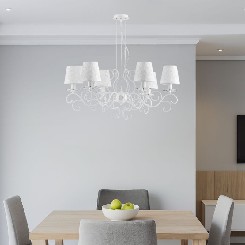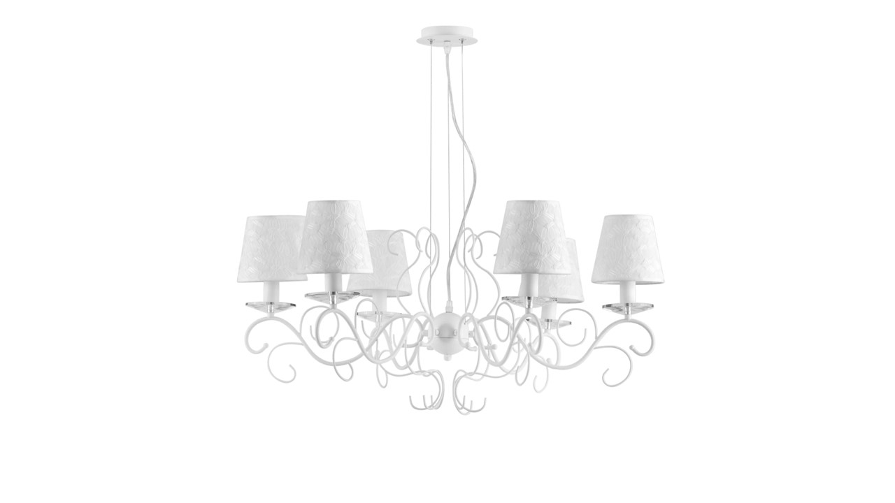 La collection Perla par Luce est un lustre en métal blanc gaufré, et six abat-jours en tissu blanc .