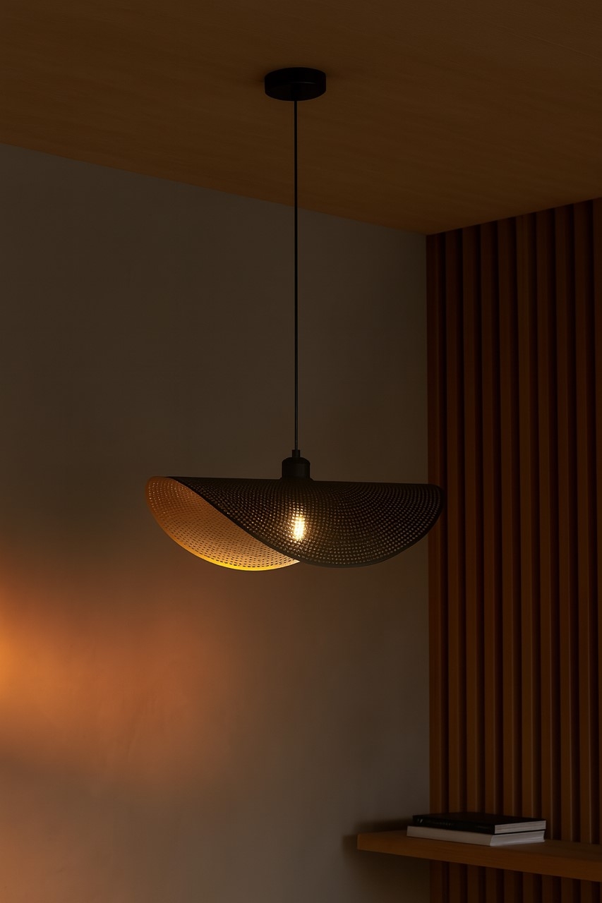 Élégante et sculpturale, cette suspension en métal perforé s’impose comme une véritable pièce déco. Son abat-jour incurvé, inspiré des formes organiques, diffuse une lumière douce et chaleureuse grâce à ses micro-perforations qui créent une ambiance raffinée.