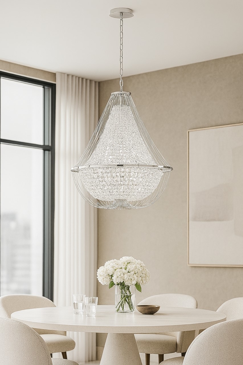 Son design inspiré des grands lustres classiques revisité avec une ligne élancée contemporaine apporte une ambiance luxueuse, idéale pour un salon majestueux, une entrée de prestige, une suite d’hôtel ou une salle à manger raffinée.
