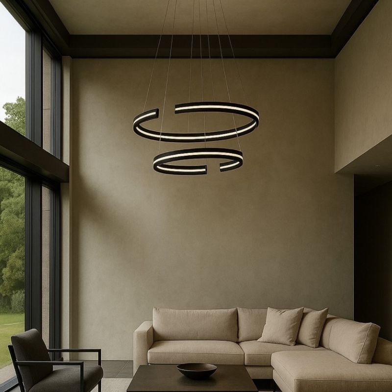 Sublimez votre intérieur avec cette suspension LED contemporaine au design sculptural. Composée de deux anneaux entrelacés en finition noir mat, elle apporte une touche architecturale et élégante à votre salon, salle à manger ou entrée avec plafond cathédrale. Grâce à ses câbles réglables, cette suspension s’adapte parfaitement à toutes les hauteurs de plafond, offrant un éclairage doux et uniforme pour une ambiance chaleureuse.