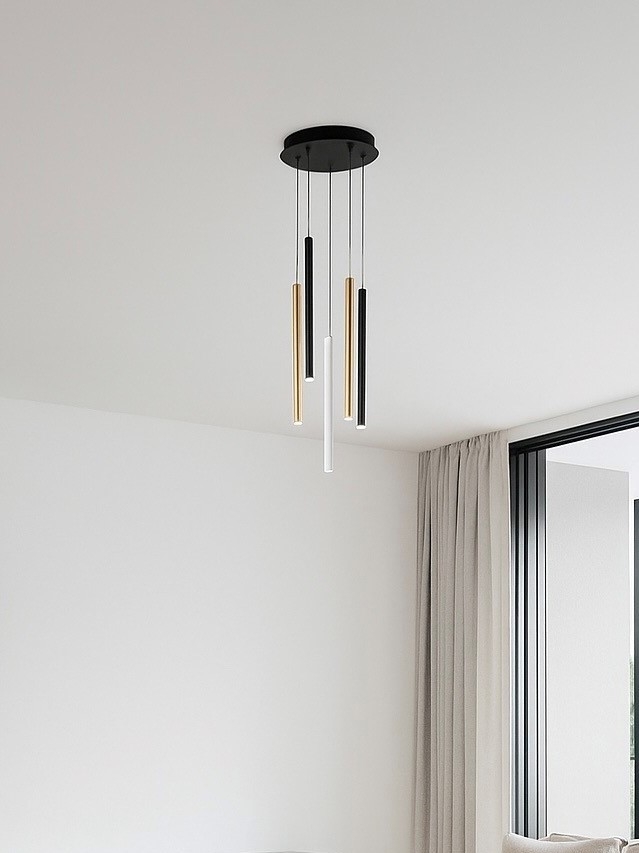 Apportez une touche d’élégance contemporaine à votre intérieur avec cette superbe suspension multi-lumières design. Composée de fines tiges cylindriques en métal noir, blanc et doré, suspendues à différentes hauteurs, elle crée un effet visuel unique et raffiné. Parfaite au-dessus d’une table de salon, dans une entrée ou une cage d’escalier, cette lampe LED suspendue allie minimalisme scandinave et luxe moderne.