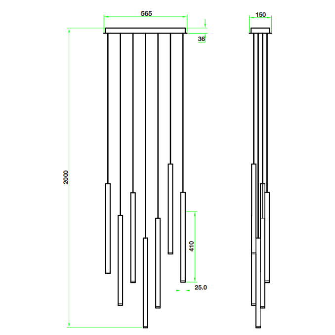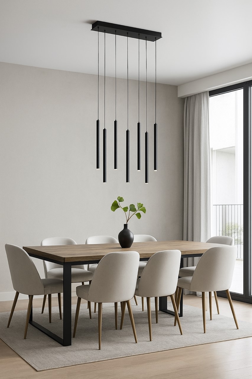 Luminaire suspendu tubulaire noir composé de 7 suspension tubulaire LED en métal noir blanc ou or , câble réglable en hauteur pour installation sur mesure (jusqu’à 2000 mm). Structure rectangulaire de 565 mm, diamètre des tiges 25 mm et longueur d’éclairage 410 mm. Faible consommation énergétique, technologie LED intégrée pour un éclairage efficace et durable, parfait pour un éclairage direct décoratif. Installation au plafond, driver inclus. Idéal pour pièces à plafond haut ou zones de circulation nécessitant un éclairage architectural.