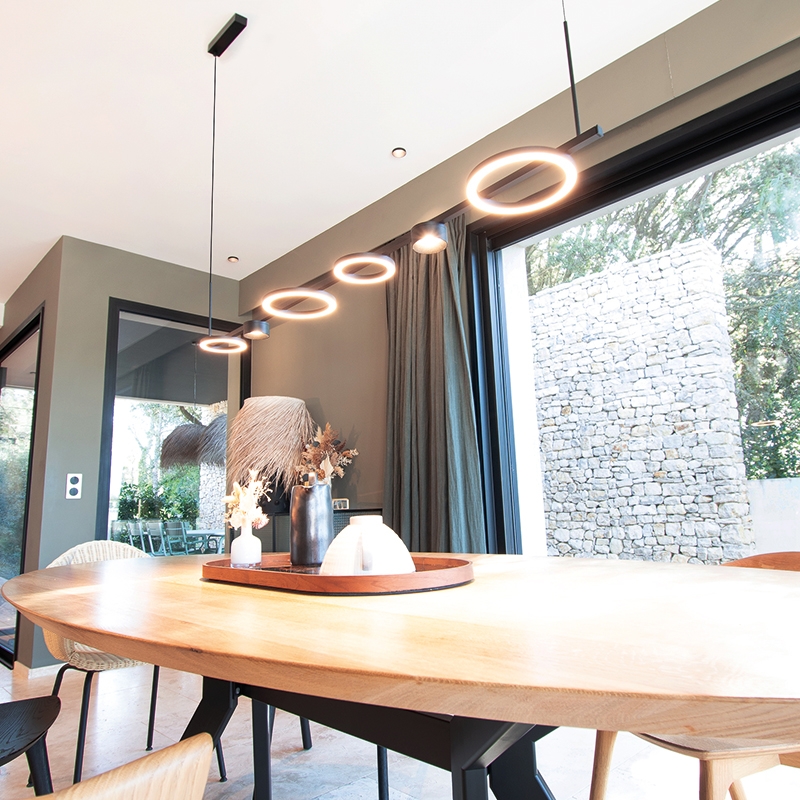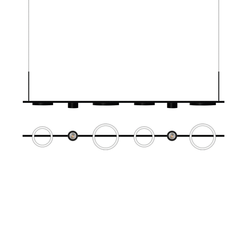 Soutenue par deux câbles discrets réglables jusqu’à 2000 mm, la barre horizontale accueille quatre anneaux lumineux et deux spots parfaitement espacés, créant un rythme visuel captivant.