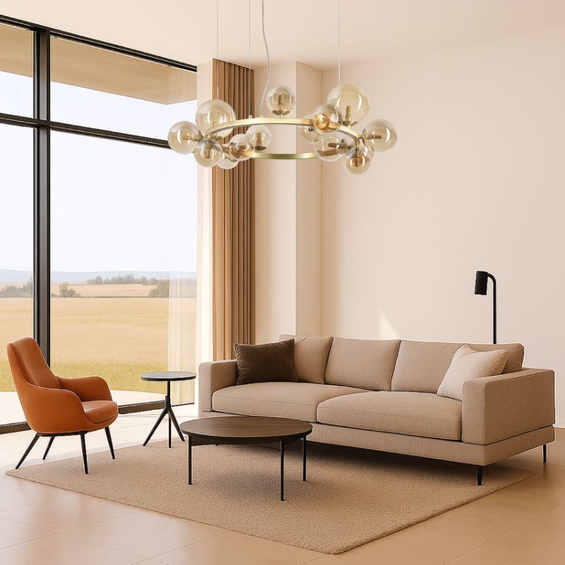 Structure métallique à structure linéaire à section ronde ou circulaire à section carrée. Diffuseurs en verre soufflé. Finitions : verre Pyrex noir mat et fumé ou laiton satiné avec verre blanc gravé ou verre ambré.