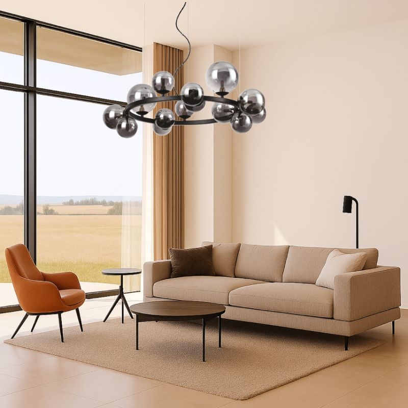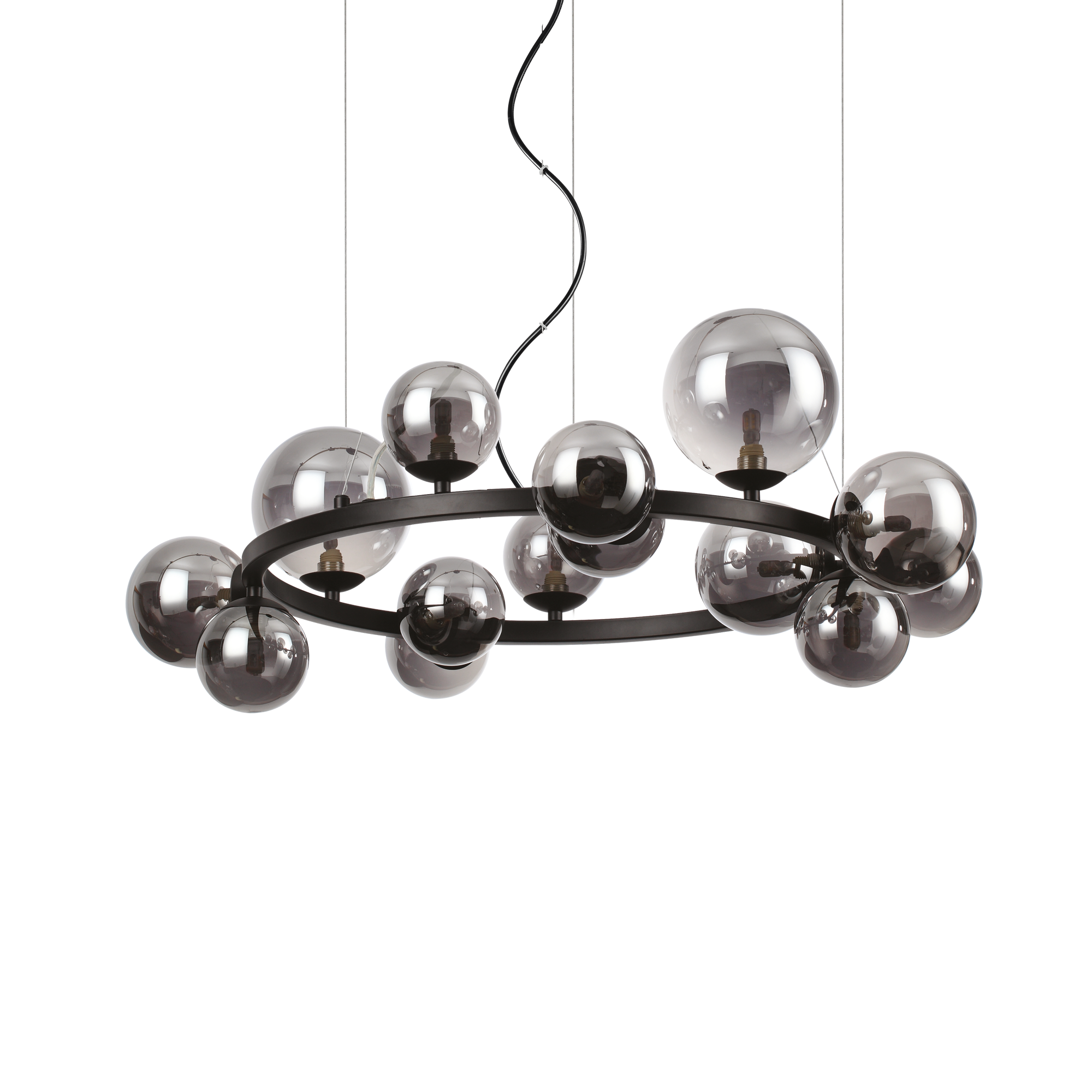 Structure métallique à structure linéaire à section ronde ou circulaire à section carrée. Diffuseurs en verre soufflé. Finitions : verre Pyrex noir mat et fumé ou laiton satiné avec verre blanc gravé ou verre ambré.